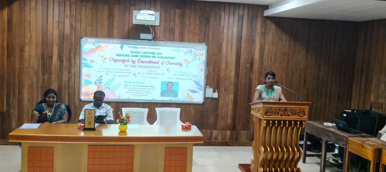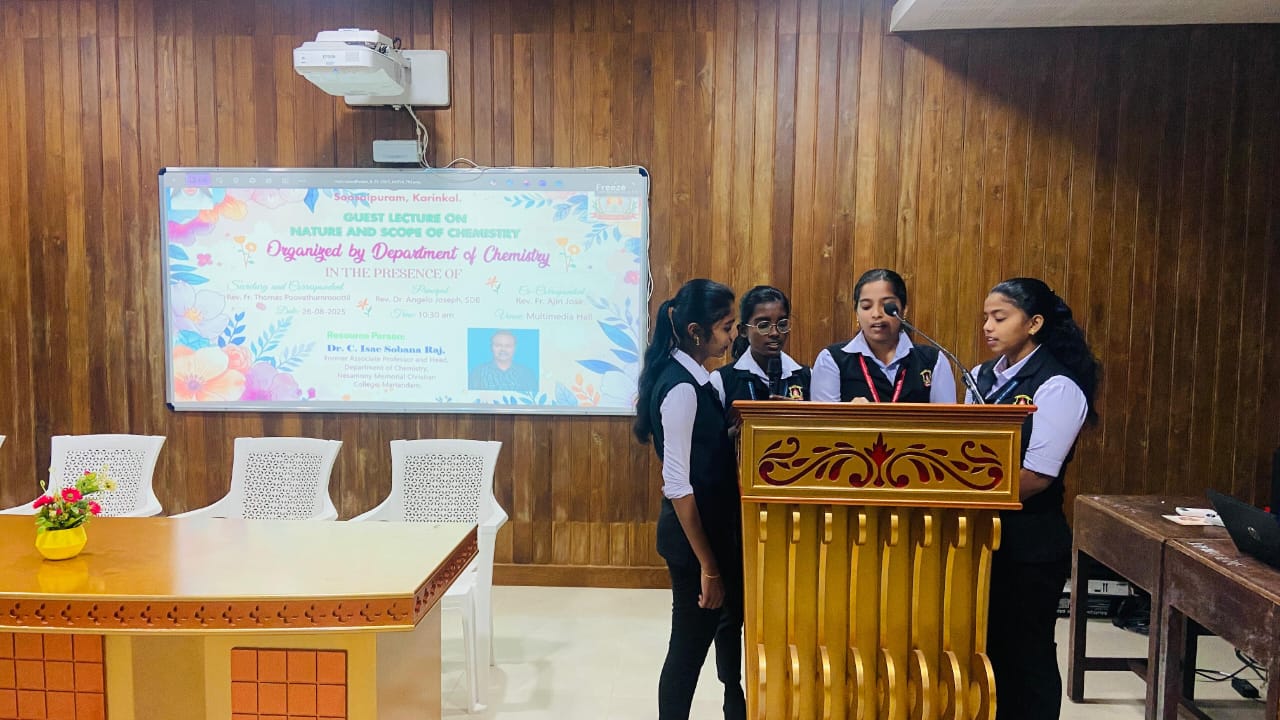 Rev.Fr Ajin Jose, the Assistant Correspondent, offered a felicitation. The chief guest, Dr. C. Isac Sobana Raj, was introduced by Ms. J. Mary Vasantham, Assistant Professor of the Department of Chemistry. Dr. Isac Sobana Raj the former Associate Professor and Head of the Department of Chemistry and Research at Nesamony Memorial Christian College, Marthandam, delivered the guest lecture on the Nature and Scope of Chemistry. The event concluded with a vote of thanks given by Dr. B. Jini Kumari, Assistant Professor of the Department of Chemistry. The masters of ceremony were Ms. S.P. Angelin Abisha and Ms. E.B. Dhona Blarin from Department of Chemistry. Department of Chemistry, we convey our special thanks to Mr. Melbin, Assistant Professor, Department of Computer Science, for his technical assistance.